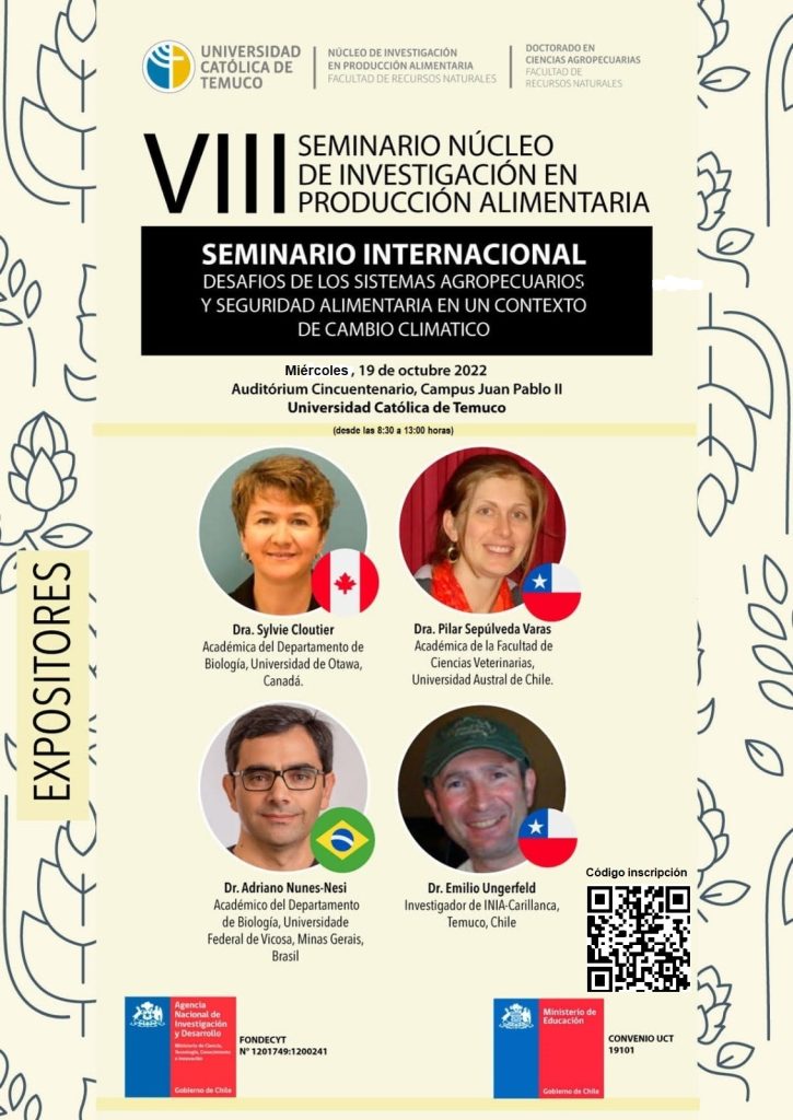 NEl Núcleo de Investigación en Producción Alimentaria y el Programa de Doctorado en Ciencias Agropecuarias, invitan cordialmente al Seminario Internacional: «Desafíos de los sistemas agropecuarios y seguridad alimentaria en un contexto de cambio climático» a realizarse presencialmente el día miércoles 19 de octubre del presente año en el Auditórium Cincuentenario, Campus Juan Pablo II (Ex. Campus Norte), de la Universidad Católica de Temuco. La actividad es abierta y gratuita previa inscripción, la cual comenzará a las 8:30 hasta las 13:00, y se podrán inscribir a través del código QR del afiche o por medio de éste link: https://forms.gle/mQBaXA2tSzKtS2Ac6